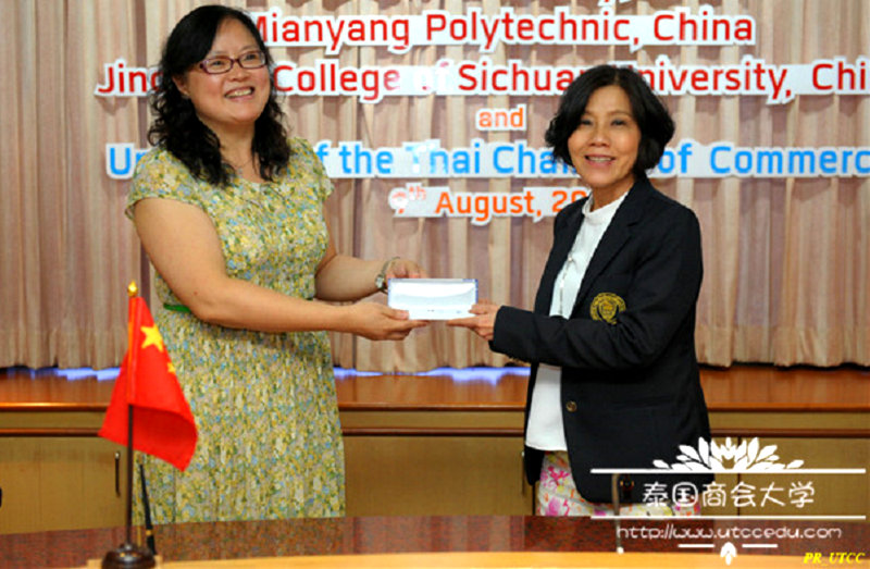 在签约环节,Saowanee博士与王婷分别代表泰国商会大学和我校签署了合作备忘录,并互赠礼品,以示友好。王婷将精心挑选的具有中国文化特色和学校特色的礼物——材料工程系学生制作的陶瓷笔——赠与了泰国商会大学,Saowanee博士也以泰国的大象木雕工艺品作为礼物回赠。