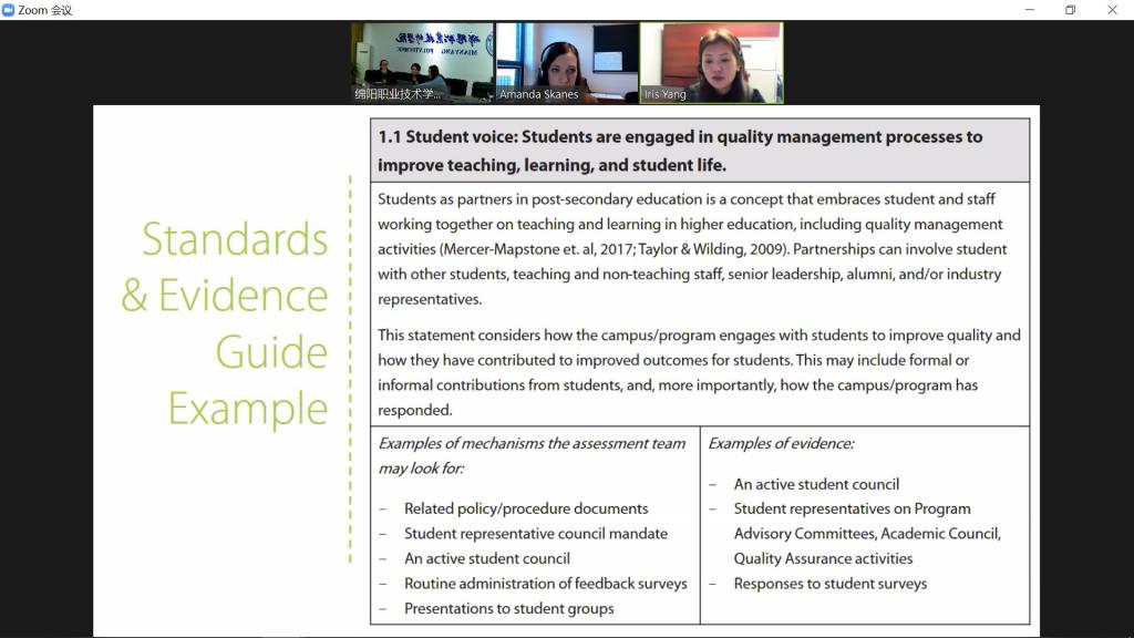 会上,Amanda对中加合作项目的新一轮教学评估框架进行了说明,包括评估方法、评估标准、评估过程及行动计划等。本次教学评估旨在审查中加合作项目开展5年来项目的现状、成果和存在的问题,从而有针对性的进行优势强化和弱项整改,推进该项目的可持续发展。本次评估将持续大概四个月左右。