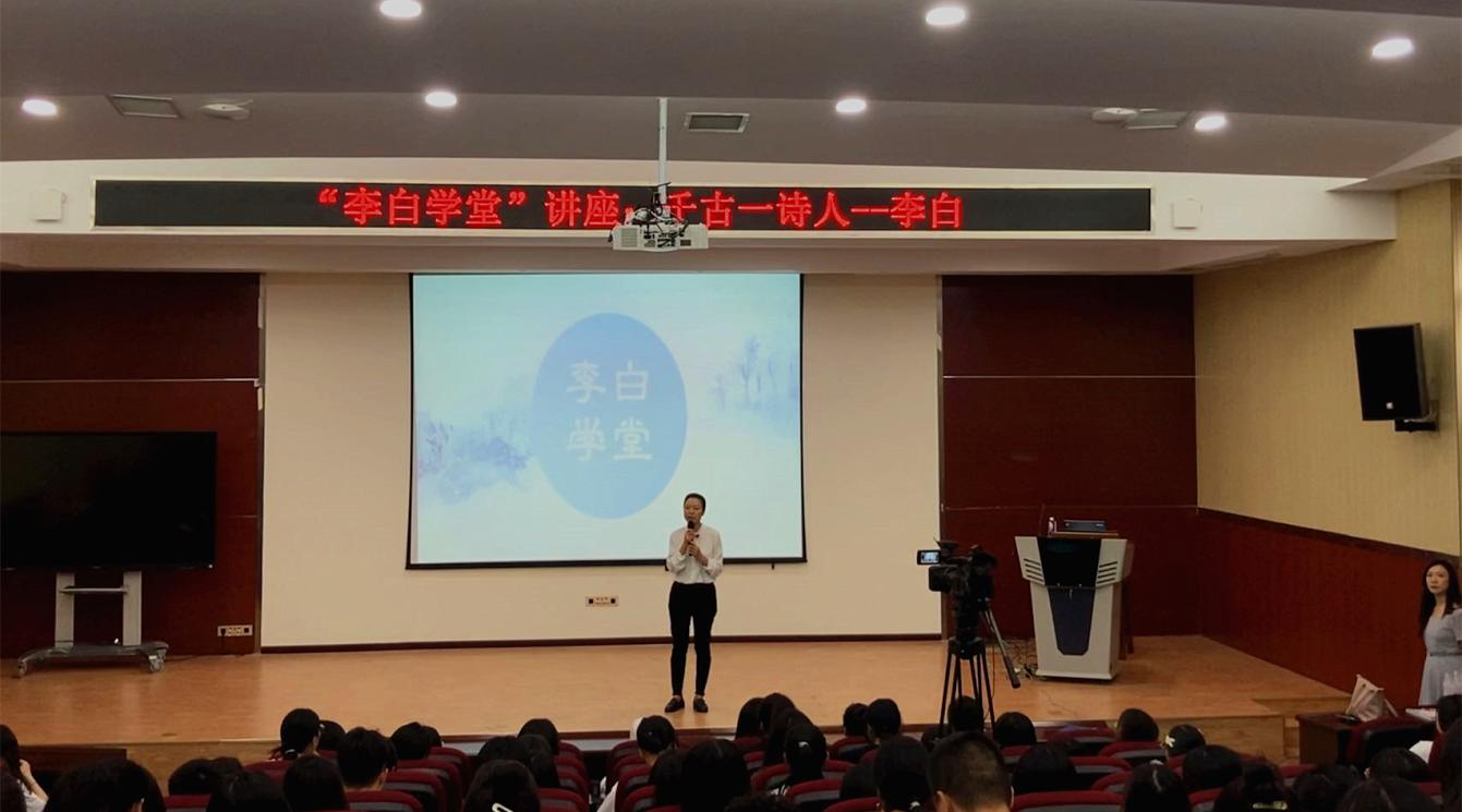 讲座中,羊利贞通过“巴山蜀水孕诗仙”、“诗成啸傲凛沧州”、“移家东鲁”、“大唐盛世犹可见”、“仗剑天涯”、“壮心报国”和“依然精爽动山川”7个板块详细讲述了李白传奇的一生,分享了他在不同时期的成长经历和诗词特点。师生们随着羊老师的讲解,仿佛看到了李白“天生我才必有用,千金散尽还复来”的自信、“大鹏一日同风起,扶摇直上九万里”的理想和志趣,也体会到了他“抽刀断水水更流,举杯消愁愁更愁”的无奈,让我们又一次感受到中国古诗词,是世界上最美丽的风景,最细腻的情感,最紧密的语言,最波澜起伏的表达。