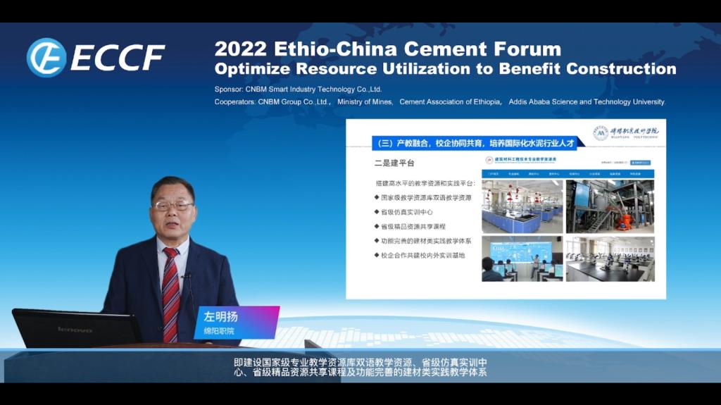 为增强中国与埃塞俄比亚两国水泥行业技术交流,促进成果转化和应用,12月9日,由中国建材智慧工业科技有限公司主办的2022年中埃水泥峰会在线上举行。学校副校长左明扬应邀出席会议并围绕“构建跨境校企共同体,培养水泥行业国际化属地化人才”作专题报告。